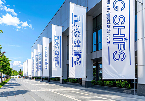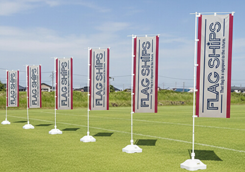 風になびいて大きく揺れて視覚効果抜群です。フルカラー印刷で写真やグラデーションも鮮やかに再現。屋外のイベントや展示会、店舗前に立ち並ぶ姿は視認性高く大きくPR可能です。