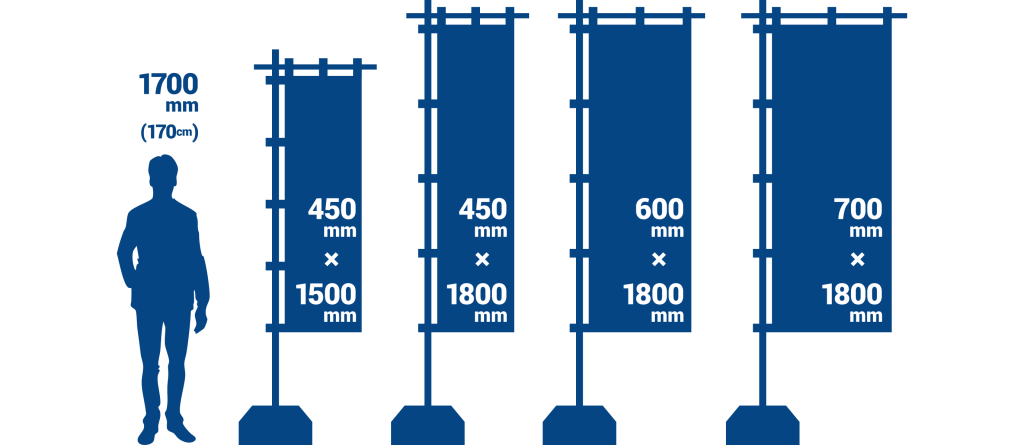 Flagshipsでは複数のサイズのぼりを選べます。一般的な縦長ののぼりは通行者の視線を引きやすい縦1800mm前後が屋外の定番サイズです。