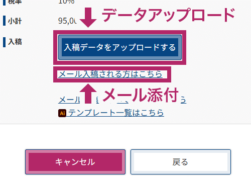 ファイルアップロードが上手くいかない場合は、ページ内のリンクより、メール添付での入稿も可能です。(ファイルの合計サイズが150M以下の場合に限る)