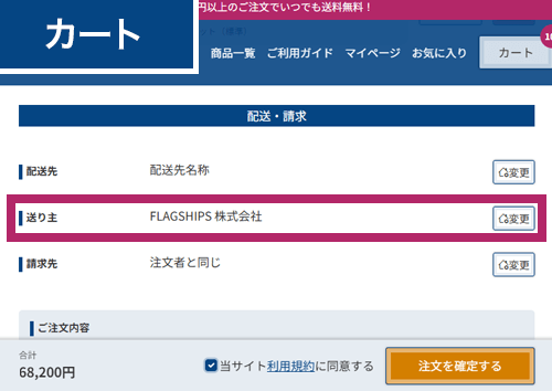 通常はFLAG SHIPS名義でのお届けですが、マイページの「送り主管理」にて登録した名義を送り主として表示できます。