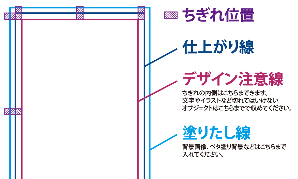 - ロゴやキャラクター、文字など切れてはいけないものはデザイン注意線内に収めてください。